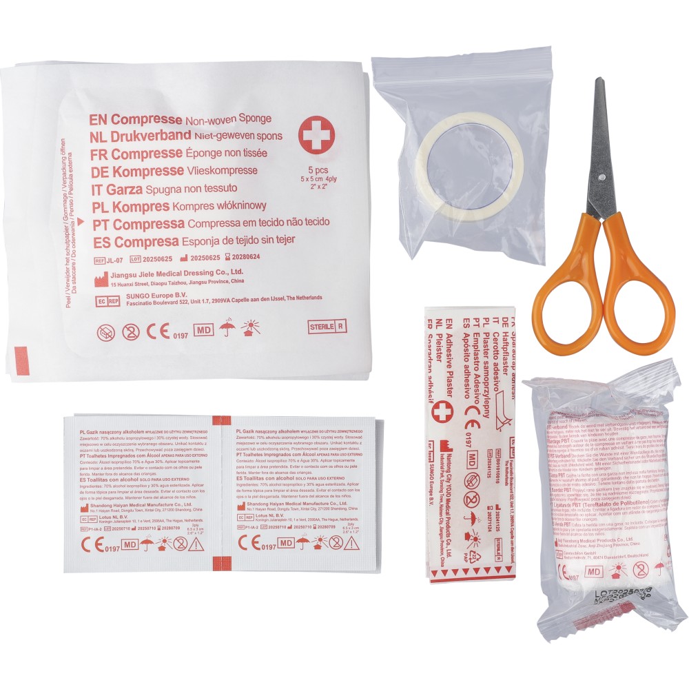 PP anyagból készült elsősegélykészlet piros tokban, a felső részen fehér kereszttel és csatos záródással. Tartalma: 2 nemszőtt törlőkendő, 5 ragtapasz, 4 alkoholos törlőkendő, 1 olló, 1 tekercs 450 cm hosszú gézkötés és 1 tekercs 450 cm hosszú ragasztószalag.