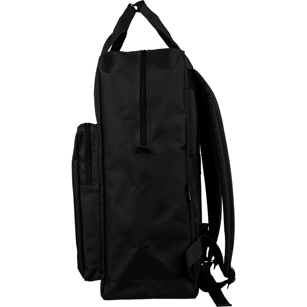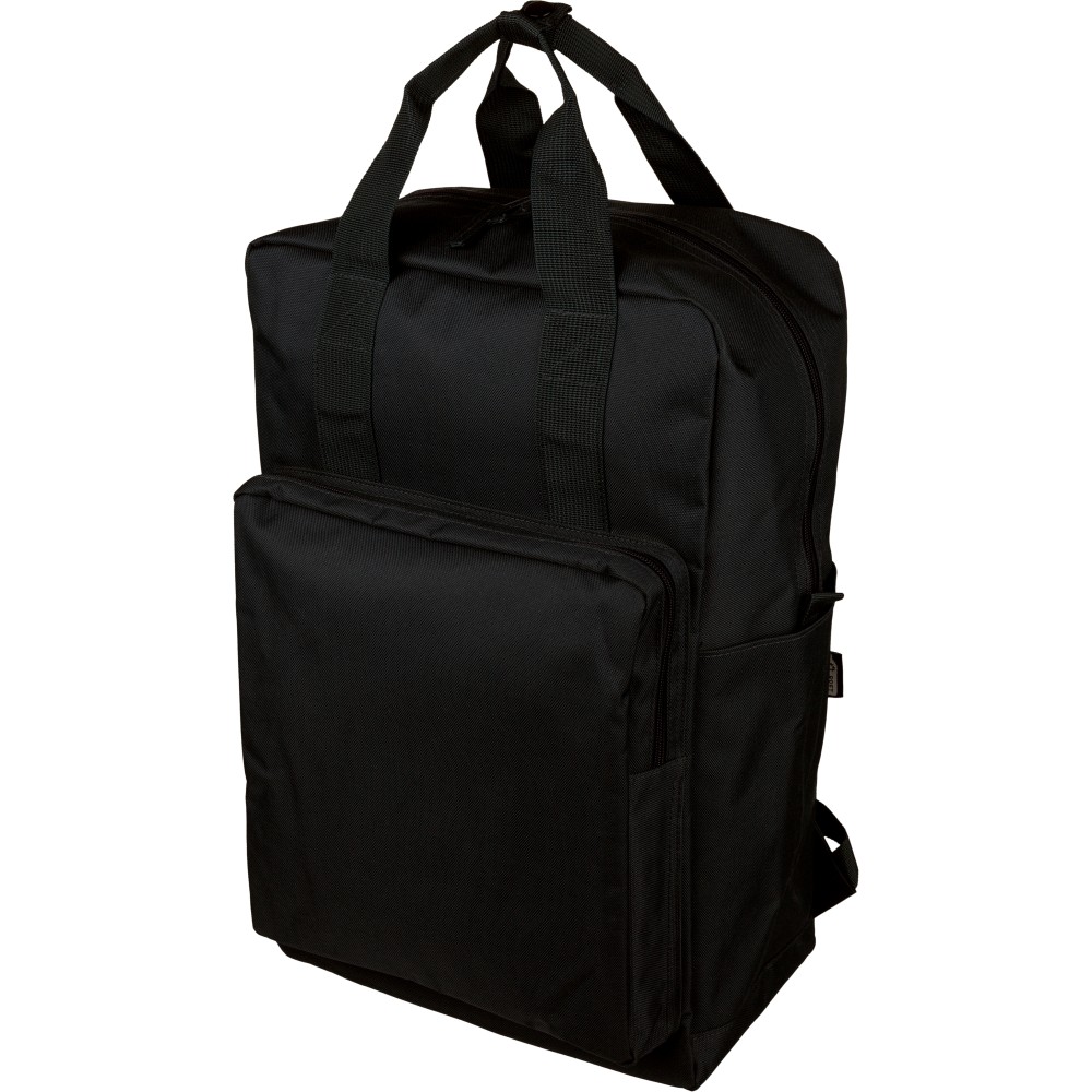 Újrahasznosított 900D poliészterből készült hátizsák, 210D béléssel és rPET címkével. Tágas fő rekesszel rendelkezik, 16?-os laptop számára kialakított külön zsebbel, elülső rekesszel, két oldalzsebbel, valamint bőröndre rögzíthető pánttal (trolley strap). Felső fogantyúi gombbal összefoghatóak, vállpántjai szellőző kialakításúak a kényelmes viselet érdekében.