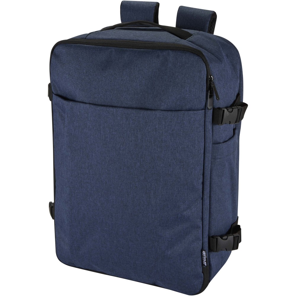 GRS tanúsítvánnyal rendelkező újrahasznosított poliészterből készült, RPET béléssel ellátott Libra hátizsák, melynek méretei megfelelnek a légitársaságok kézipoggyászra vonatkozó előírásainak. A táska egy dedikált, legfeljebb 17" méretű eszközök fogadására alkalmas laptoptartó rekesszel, valamint egy tágas főrésszel rendelkezik, amelyben rugalmas pántok és hálós elválasztók biztosítják a tartalom rendezettségét. Az elülső oldalon két nagyméretű cipzáras zseb található az alapvető kellékek gyors eléréséhez. A kényelmes viseletről és a praktikus szállításról légáteresztő hátpanel, bőröndre rögzíthető pánt, állítható vállpántok, mellkaspánt, valamint felső és oldalsó hordozófogantyúk gondoskodnak. Letisztult megjelenése és funkcionális kialakítása miatt kiváló választás üzleti utakhoz vagy irodán kívüli munkavégzéshez, miközben alapanyaga az öko-tudatosságot tükrözi.