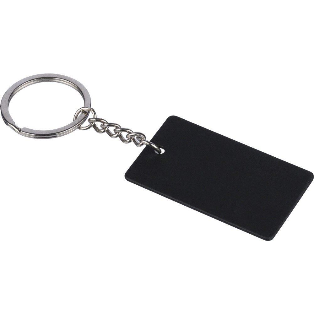 Újrahasznosított rozsdamentes acélból készült, gumírozott felületű, téglalap alakú kulcstartó fém karikával. A kulcstartón gravírozott recycled (újrahasznosított) alapanyagra utaló logó található, amely gravírozás után fényes, tükörszerű hatást mutat. Egyenként kraft papírtasakba csomagolva.