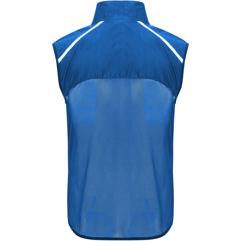 Szélálló és légáteresztő. Elülső cipzár azonos színű állvédővel. Rugalmas szegély a karkivágásnál és az alján. A hát alsó része mikroperforált anyagból készült. Fényvisszaverő csíkok a vállán. Zseb rugalmas pánttal, amelybe a mellényt el lehet csomagolni. Eltávolítható címke.
