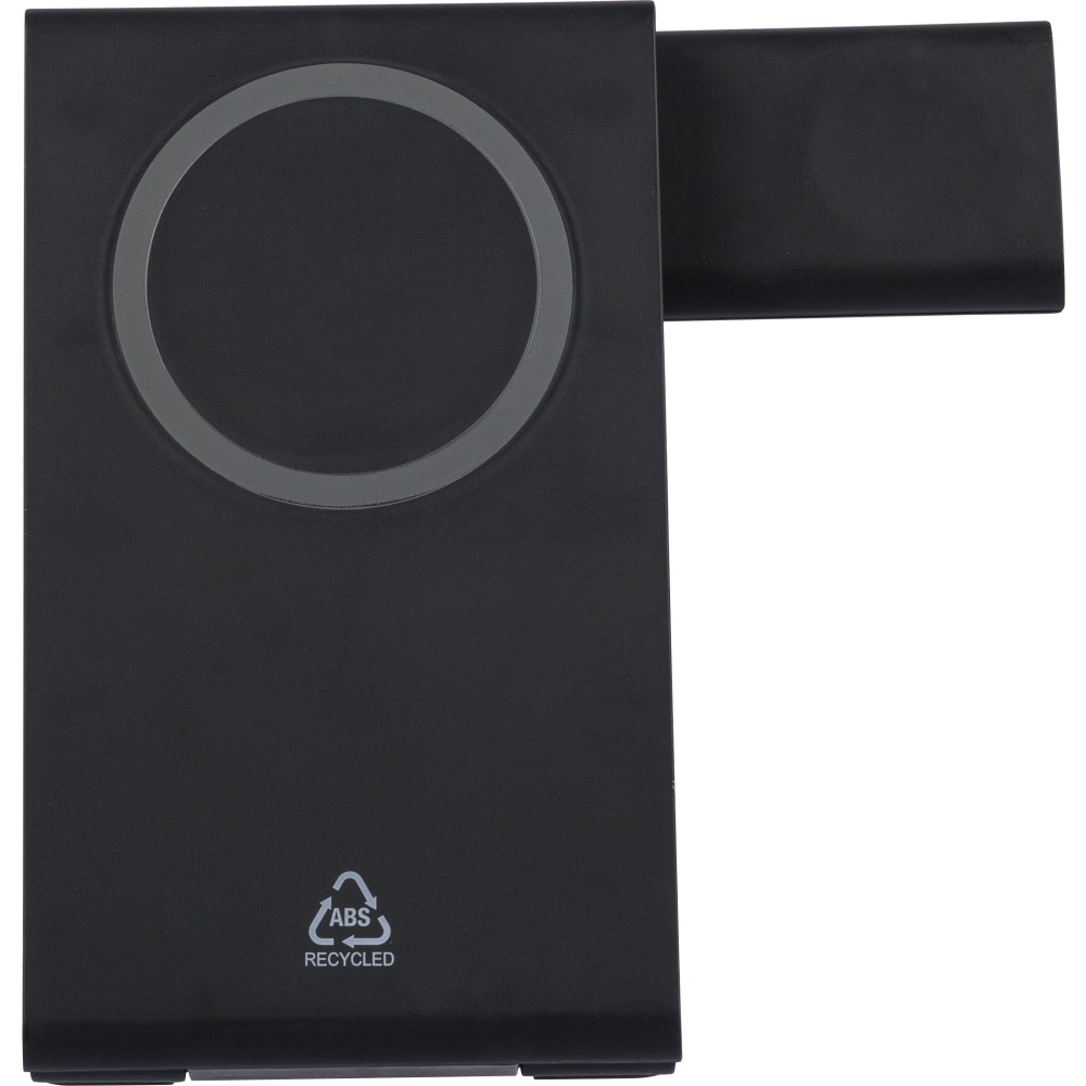 Újrahasznosított ABS-ből készült 3 az 1-ben mágneses töltő, amely 15W teljesítménnyel telefont, 5W-tal AirPods fülhallgatót, valamint 2W-tal iWatch okosórát tölt. Ultralapos kialakítású, felhajtható támasztékkal. Bemenet: 5V/3A vagy 9V/3A. A terméktesten recycled (újrahasznosított) alapanyagra utaló logó található. Barna dobozba csomagolva.