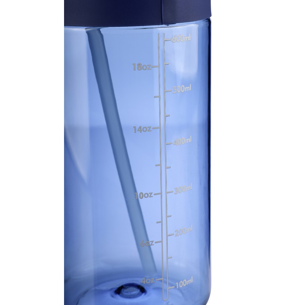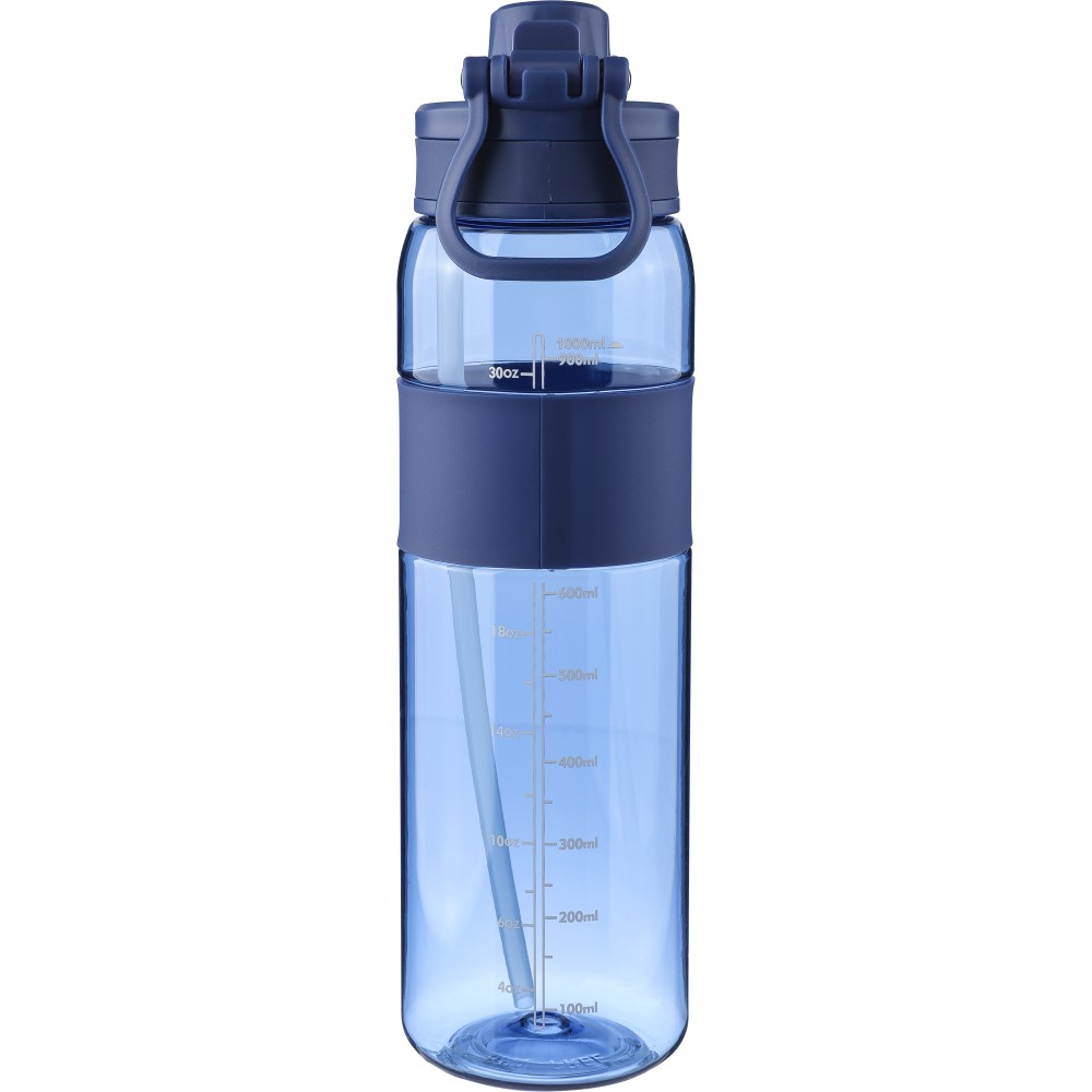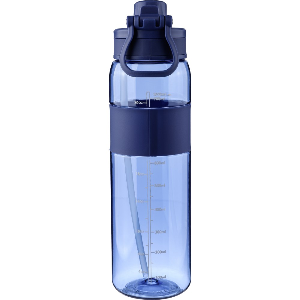 Tritán kulacs, 900 ml-es. Kétféle használati lehetőséggel: csavaros záródású kupak vagy visszahajtható végű szívószál. Szilikon markolattal, PP hordozófüllel és nyomtatott űrtartalom-jelzővel.